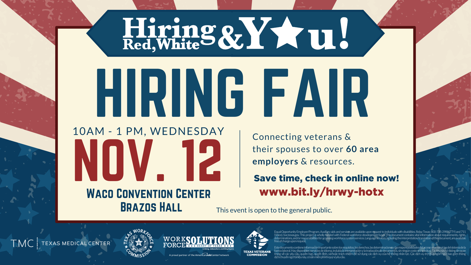 60+ employers, 1,000+ job openings, one hiring event. Don’t miss the 14th annual Hiring Red, White & You! Hiring Fair on Wednesday, Nov. 12, from 10 AM to 1 PM. Save time, and check in online now! 👉 www.bit.ly/hrwy-hotx