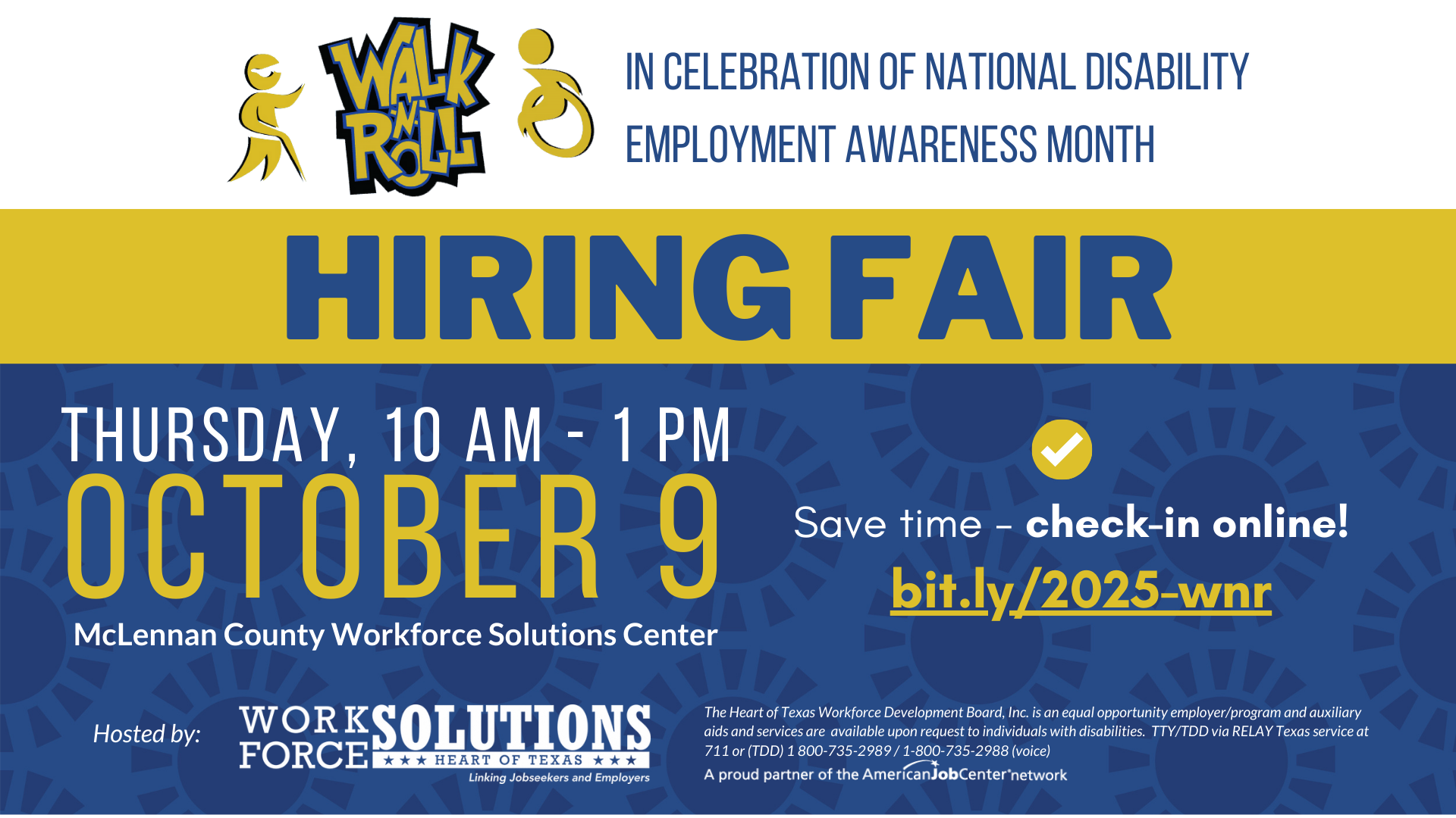 The Walk-N-Roll Hiring Fair is your one-stop-shop to meet face to face with employers, learn about job openings, and even apply to jobs on site! Save time, check in online now. Get the details below.👇