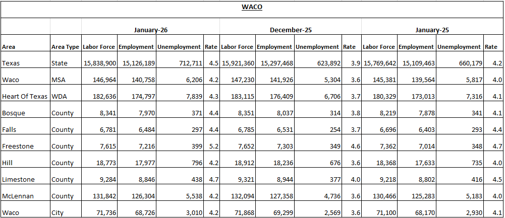 Heart of Texas Unemployment Rate Reaches 4.3% in January 2026 WACO, Texas — According to the latest data from TexasLMI.com, the Heart of Texas regional unemployment rate rose to 4.3% in January 2026, up from 3.7% in December. The rate reflects 7,839 residents actively...