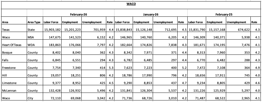 Heart of Texas Unemployment Rate Edges Down in February WACO, Texas — New data from TexasLMI.com shows the Heart of Texas regional unemployment rate at 4.2% in February 2026, a slight decrease from 4.3% in January. The total includes 7,797 individuals currently...